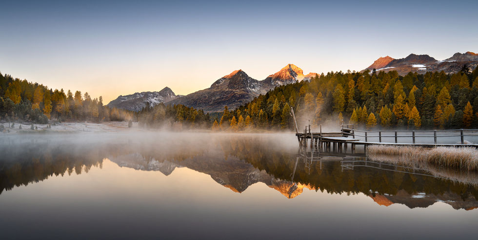 Autumn in the Engadine transforms the landscape into a golden dream as larch trees turn fiery hues, contrasting with the first snow. This fleeting season is a favorite of mine, where shimmering golden foliage meets crisp air, signaling winter’s approach.